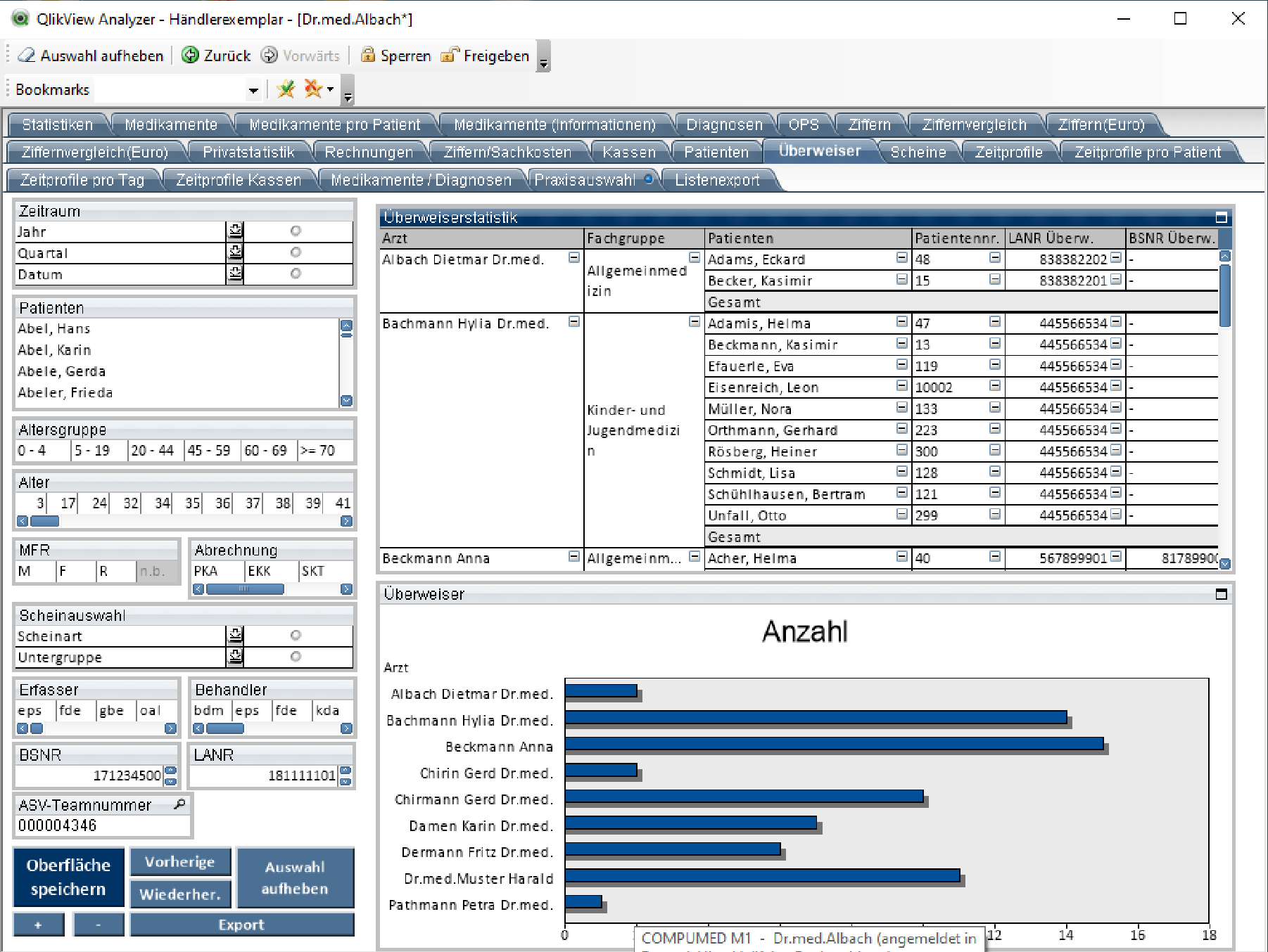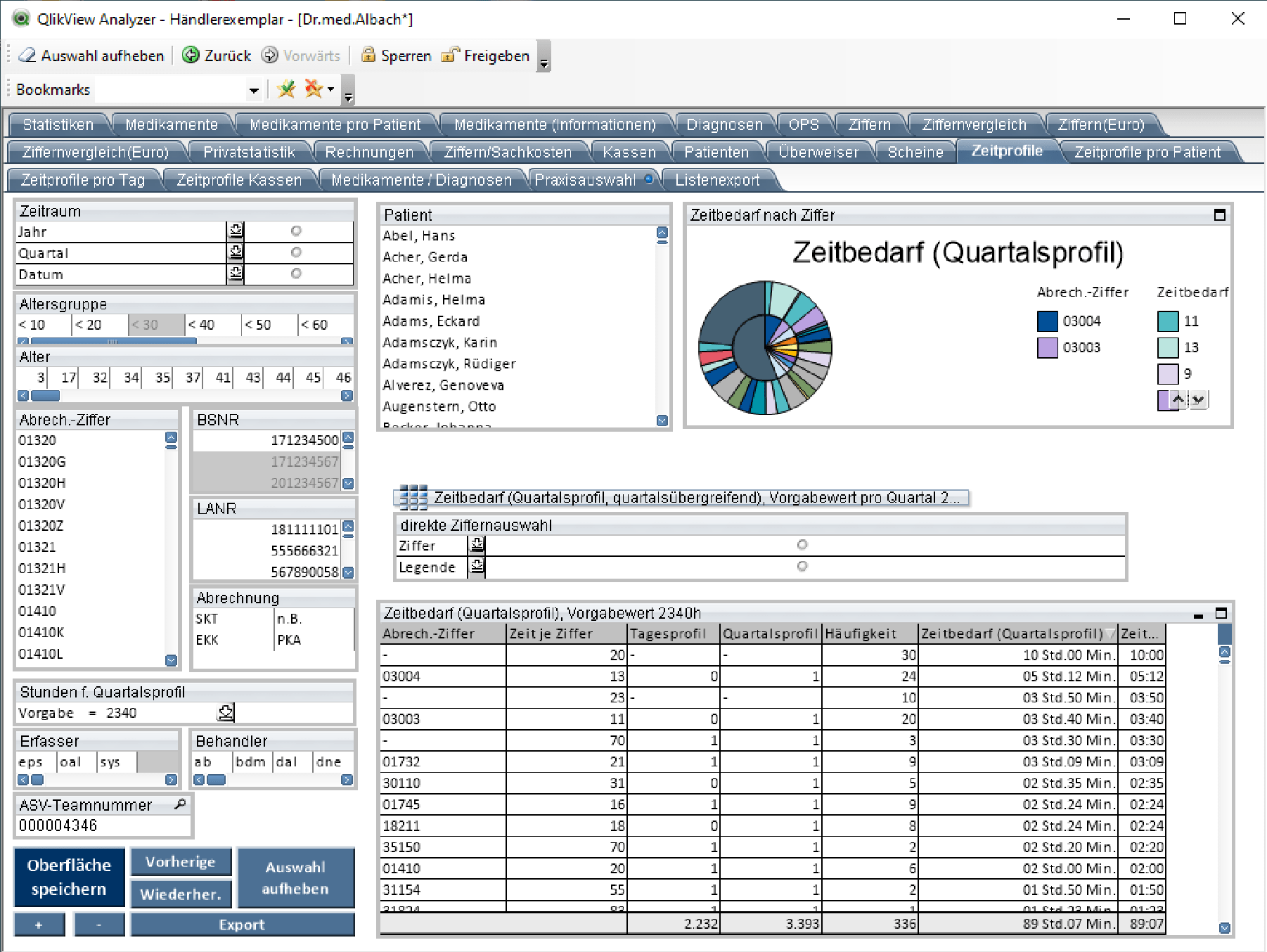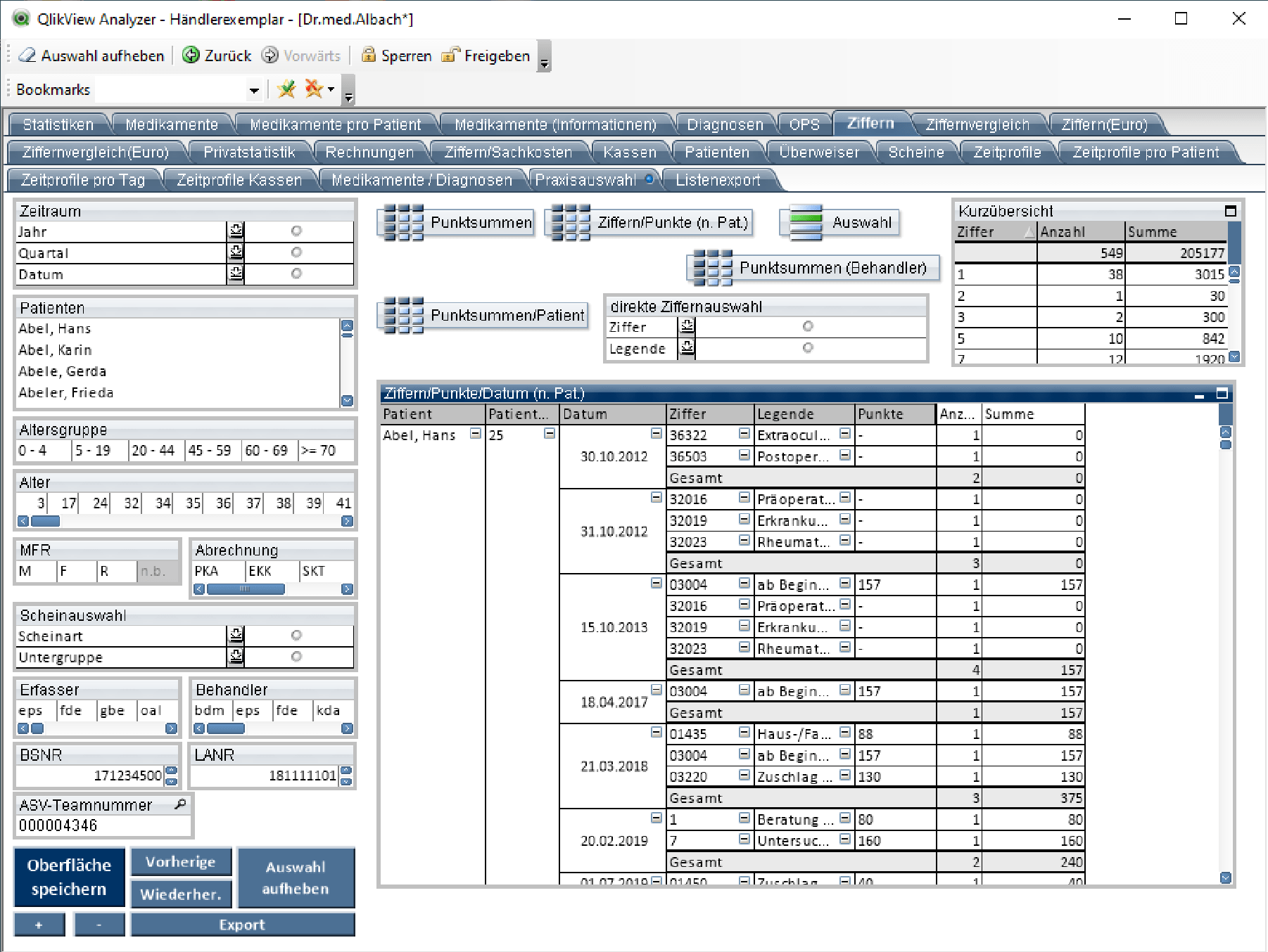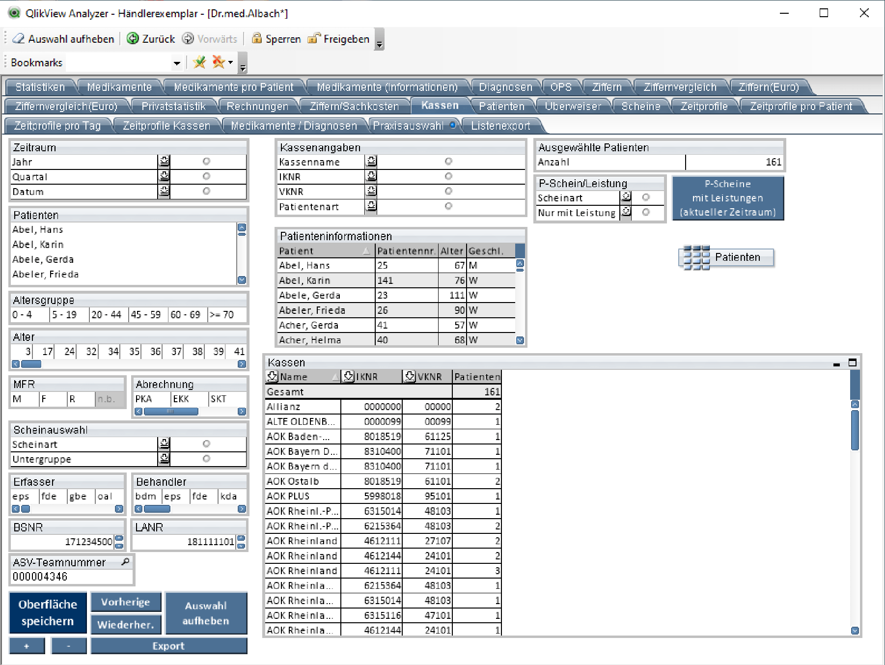 Mit dem Guided Analytics-Tool QlikView erhalten Sie einen schnellen Überblick über den kompletten Datenbestand in Ihrem Praxisverwaltungssystem. Sie können Informationen aus verschiedenen Quellen zusammenstellen und vergleichen. Mit der Analyse Ihrer Datenbank können Sie die Effizienz Ihrer Prozesse steigern und die Wirtschaftlichkeit nachhaltig verbessern.